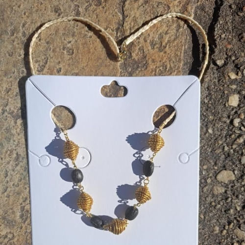 Este colar é uma verdadeira obra de arte feita à mão, combinando elementos naturais e um acabamento exclusivo que não escurece com o tempo, garantindo durabilidade e sofisticação.