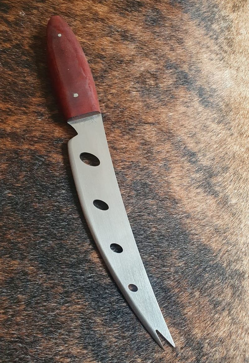 Esta faca artesanal para queijo é uma ferramenta elegante e funcional, ideal para os amantes da culinária e apresentações sofisticadas. Forjada em aço inox 420, a lâmina oferece excelente resistência à corrosão, durabilidade e fácil manutenção, sendo perfeita para cortes limpos e precisos em diferentes tipos de queijo. Os furos estrategicamente posicionados na lâmina evitam que os queijos mais macios grudem, garantindo um corte mais eficiente.