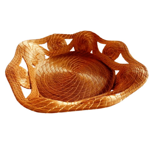 A fruteira artesanal em capim dourado e linha encanta pelo seu design exclusivo em formato de mandala, com tramas espiraladas que realçam o brilho natural do capim dourado. As alças vazadas e o acabamento minucioso conferem leveza, sofisticação e um toque artístico à peça, tornando-a um verdadeiro destaque na decoração.